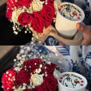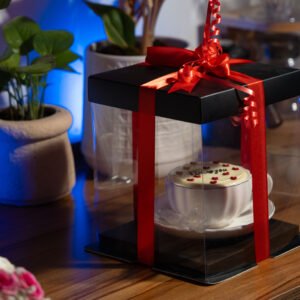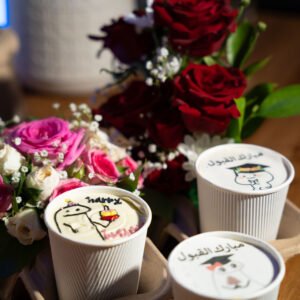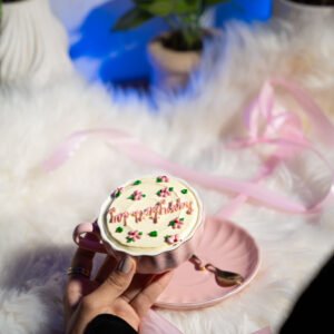 كوب سيراميك أنيق يقدم بطريقة مميزة مع الكيك الطازج داخل الكوب، ليمنح تجربة مختلفة تجمع بين المذاق اللذيذ والشكل الجذاب.