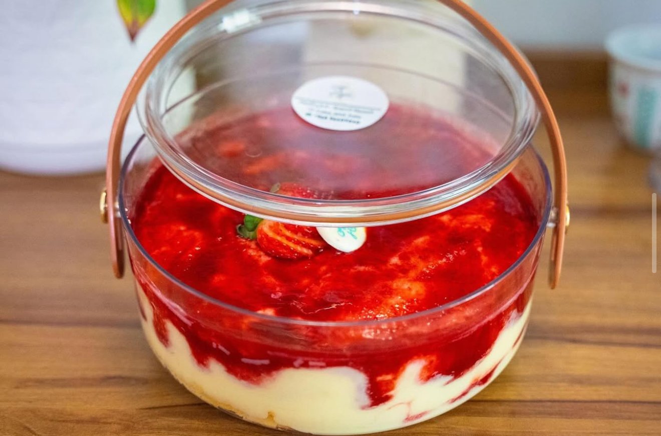 ترايفل الفراولة الكلاسيكي بطبقاته الإسفنجية الناعمة وكريمته المخملية، مزين بقطع الفراولة الطازجة وصوص الفراولة اللذيذ. نكهة متوازنة بين الحلاوة والانتعاش تجعلها خياراً رائعاً لكل محبي الفواكه.