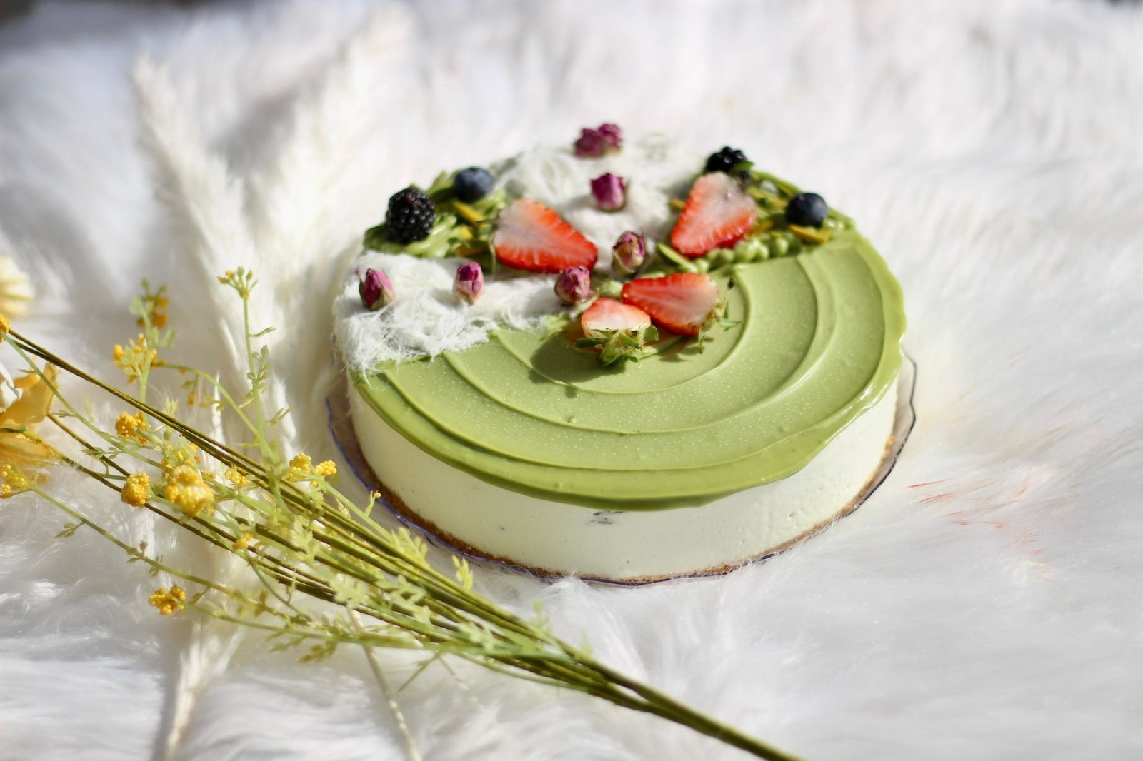 تشيز كيك فستق فاخرة بطبقة كريمية غنية وصوص فستق شهي، مزينة بلمسة فواكه طازجة تمنحك مزيجاً متكاملاً من الطعم والجمال.